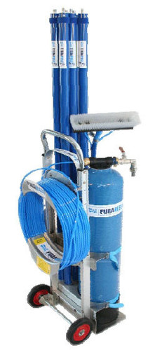 Activando una pequeña bomba de impulsión el agua pura del depósito sube a través de un conducto por el interior de la pértiga y la arroja a través de las cerdas del cepillo sobre la superficie que se desea limpiar. El operario acompaña este baño de agua pura con un suave cepillado para ayudar a poner en solución todas las partículas adosadas a la superficie (suciedad), bien sean de grasa, jabón de lavados anteriores, polvo, tierra, cal, etc. El agua pura va absorbiendo todas estas impurezas y cayendo al suelo, dejando el cristal más que limpio, completamente estéril. Ello permite limpiar incluso los marcos, rendijas, etc y dejar secar al aire de forma natural SIN DEJAR MARCAS al secar, puesto que las pequeñas gotas que quedan después del cepillado son exclusivamente de agua químicamente pura.