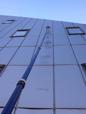La limpieza se realiza con agua tratada por nuestros equipos, procedente del suministro habitual, que a través de un sistema de filtrado de 5 pasos, queda exenta de las sustancias que dejan residuos en los cristales. Combinando la acción dinámica del cepillado, con el agua pura bombeada a las pértigas, obtenemos una limpieza óptima. La superficie se deja secar de forma natural, desapareciendo las gotas restantes sin dejar rastro.